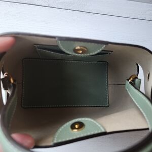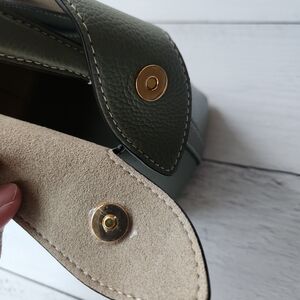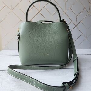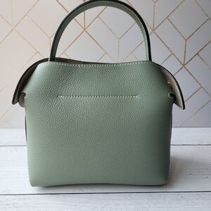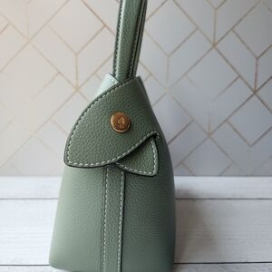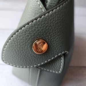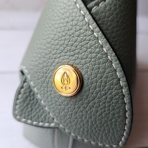 A supple silhouette, an elegant touch with its top handle, the sides fold and unfold like the beating of a wing, for an airy look. The Swann, available in a mini format, has an elongated shoulder strap that leaves your hands free. Be in harmony with nature with our Fleuron bag in almond green color. This soft and relaxing shade is perfect for those looking to add a touch of tranquility to their wardrobe. Made in Italy with grained calf leather, this bag features a beige interior and golden details.