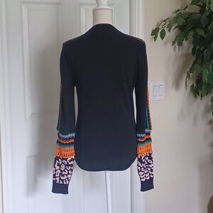 Add bold personality to your casual wardrobe with the Free People “Switch It Up” thermal in navy combo. This unique top features a textured waffle knit body with vibrant crochet and knit colorblock detailing along the sleeves. From colorful open-weave crochet near the elbows to cozy jacquard knit cuffs with mustard leopard print on a gray background, this top is full of eye-catching charm. The mock neckline and rounded hem create a flattering silhouette that’s easy to pair with denim or leggings. Excellent used condition. Style it tucked or untucked for an effortlessly cool Free People vibe.