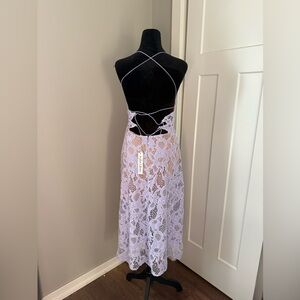 • Lace dress in midi silhouette w/ asymmetrical, cowl neckline