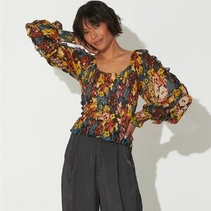 Vibrant floral blouse with long sleeves. Features a smocked bodice and ruffled details. Perfect for a chic look.