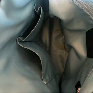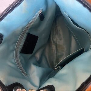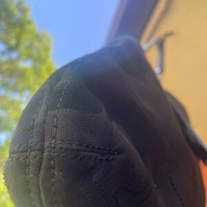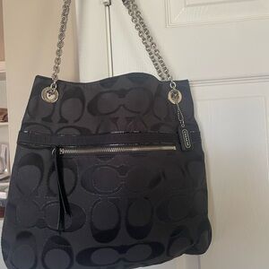 Chic Coach shoulder bag with signature pattern. Features black and gray tones. Stylish chain strap and front zipper pocket.