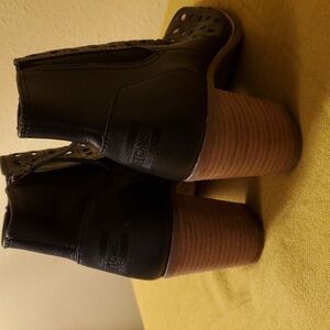 9.5 Toms Black Ankle Booties style #301214. Material say made in China. Very nice heeled booties! Like Brand new. Likely never worn. There is a little sticker residue on the inside of the left shoe and the bottom of the right, with some signs of wear (likely from trying on and walking) on the bottoms as shown in the photos. Please feel free to ask any questions, check out my other listings. I ship Fast.