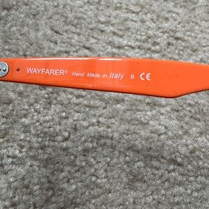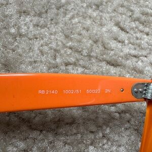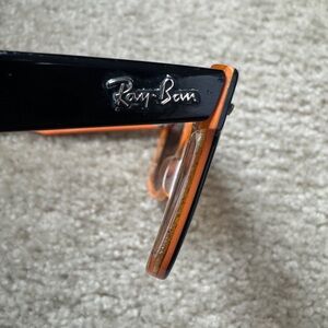 Stylish Ray-Ban sunglasses featuring a sleek black frame with vibrant orange accents. Comes with a classic brown case.