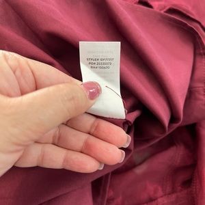 Elegant burgundy maxi dress. Features ruffled details and asymmetrical hem. Perfect for special occasions.
