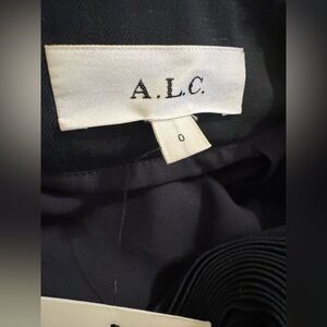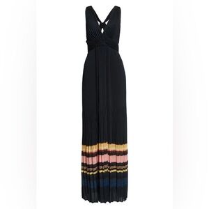 The A.L.C. Everly Stripe Pleat Maxi Dress features a deep V-neck, sleeveless design, and a contrasting stripe pattern. The dress is fully lined and made of 100% polyester