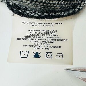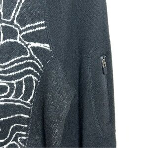 Pullover Extra fine merino wool and poly blend quarter zip sweater, size small, please see photos for measurements. Zipper key pocket on arm, Black and white Woodcut Botanical pattern. Comfortable and versatile for any occasion, great for layering. Fitted Style. 14 oz shipped.