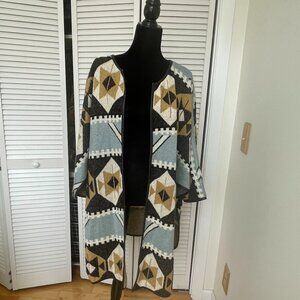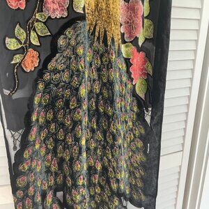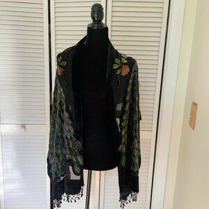 Beautiful festive scarf in dark muted colors with small shiny beads and black fringes made of beads. Measurements are 76" x 20".