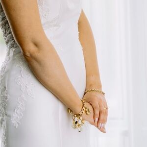 Charming wedding-themed set. Features bride and groom charms. Gold accents with cream details. Perfect for adding elegance to your wedding day!