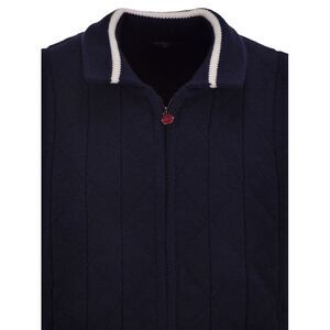 A garment that embodies the charm of tradition and the energy of relaxed elegance. This full-zip cardigan is made entirely of cashmere, expertly crafted to achieve a compact texture that highlights the contrasting trim details, giving it a more sporty allure. The full-length zip front adds functionality and a contemporary touch, while the ribbed knit ensures comfort and versatility for any occasion. Designed to accompany a dynamic yet always measured style, this garment represents a perfect balance between formal sophistication and informal spirit. Every detail is crafted with care, combining experience, attention to detail and aesthetic vision. - Zip closure. - Ribbed knit - Contrasting colour trim DESIGNER ID: UMK075502001