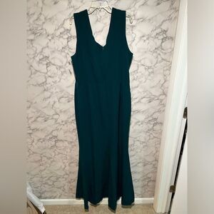 This striking floor-length style is made in our classic stretch crepe in Pine. This sleeveless mermaid gown fits snuggly through the torso and hips and has a subtly flared skirt. It features a plunging v-neckline, curved v-back, and a thigh-high side slit.