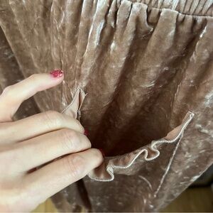 These Bollie crushed velvet joggers are the perfect blend of comfort and style. The beige/tan/khaki color palette is both versatile and trendy, while the feminine ruffle detail around the two functional pockets adds a touch of sophistication. Adorable keyhole cutouts near ankle.