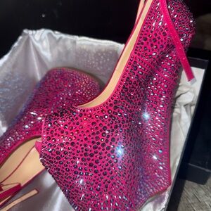 This heel has been very gently worn once indoors. All crystals are still intact. The heel is even more beautiful in person!