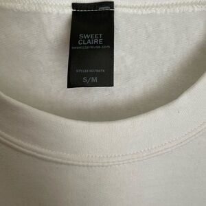 Chic white sweatshirt by Sweet Claire. Features a lively print in pink, orange, and purple.