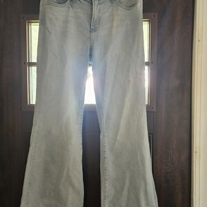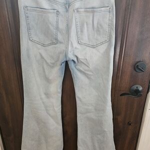 Chic and stylish flare jeans. Light blue hue. Perfect for casual outings.