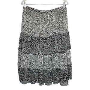 The Notations tiered skirt offers a refined blend of comfort and style. Its elastic waistband ensures a snug fit, while the polyester fabric provides a lightweight feel. The black and white floral pattern adds a classic touch for a versatile look.