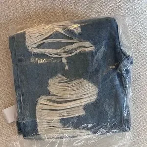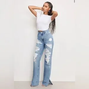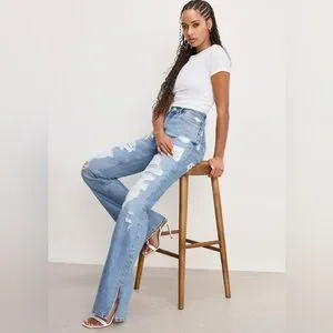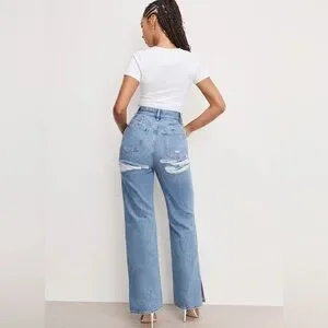 These super high-rise jeans are fitted through the legs and relax below the knee for a vintage-inspired straight silhouette. Extreme distressing adds a bold, edgy, worn-in look.