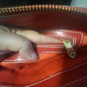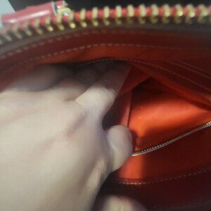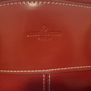 This authentic Louis Vuitton Red Suhali Lockit PM Bag is a striking piece crafted from luxurious red Suhali goat leather, known for its rich texture and durability. The bag features the iconic Lockit PM design with rolled leather handles, contrast topstitching, and polished brass hardware, exuding timeless elegance. Please note, the signature lock is missing, as visible in the provided pictures. The bag shows signs of wear, lovingly used, with minor scuffs, creases, and edge wear on the exterior, along with slight discoloration and wear on the handles. The interior, lined with Louis Vuitton's monogrammed textile, may exhibit light scuffs consistent with pre-loved condition. Measuring approximately 11.8" L x 9.8" H x 5.2" D with a 4.5" handle drop, this bag remains a chic and sophisticated addition to any collection, perfect for those who appreciate vintage luxury with character.