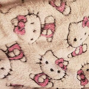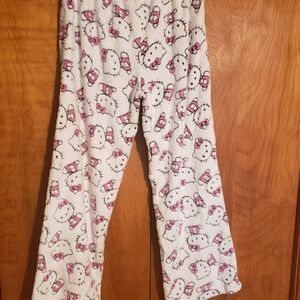 Soft fleece pajama pants with Hello Kitty print. Features a charming white and pink design. Perfect for cozy nights.