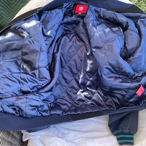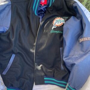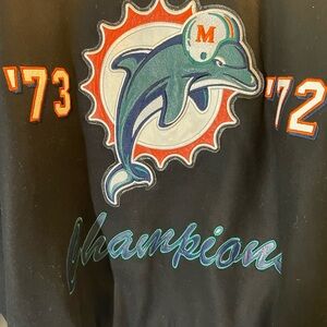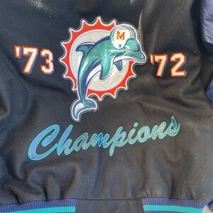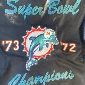 NFL Super Bowl ‘72 ‘73 Miami Dolphins Champion jacket. Features bold graphics and a comfortable fit. Size: XXL; 67% wool, 33% viscose; front zipper, side pockets, inside pockets, one with a zipper; used, in good condition