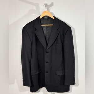 Classic Brooks Brothers two-piece men’s suit, made in the USA. Constructed from 100% pure wool in a navy micro-check pattern. Jacket features a two-button closure and notched lapels, with matching pleated trousers.