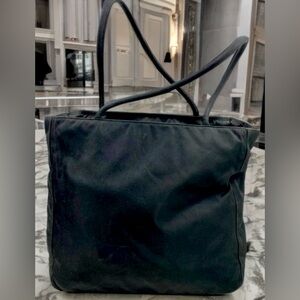Crafted from durable navy blue nylon and accented with rich brown leather trim, this tote features: