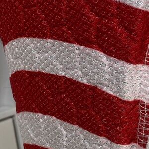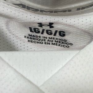 White sleeveless top with bold red stripe accents. Features a sporty Under Armour logo. This type of apparel is designed for athletes and features:
