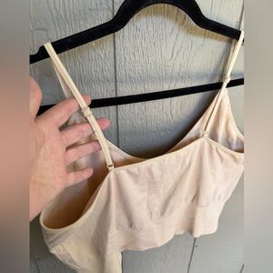 This is a cream colored Boohoo bra. It’s a size 24/26. It has adjustable straps. I only wore it a couple of times and washed it according to the instructions. There are some fuzzies on the inside. It’s in great condition.