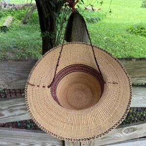 African Handwoven Elephant Grass Bolga Sun Hat Maroon Detail Leather Chinstrap