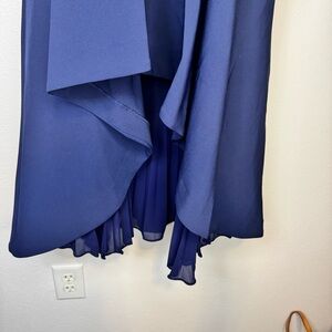 About 44" from shoulder to hem Elegant navy dress with a high-low hem. Features a sleeveless design and ruffle detail. Perfect for special occasions. Classic Flirty Romantic Preppy