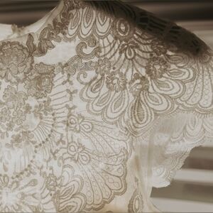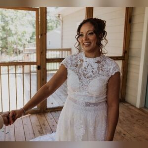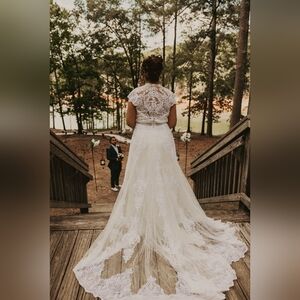 Stunning lace Melissa Sweet ivory wedding dress with intricate detailing with sheer illusion lace neckline, made of polyester. Dress size 10 street size 8. There is clear sequins adding a bit of sparkle. It is both traditional and bohemian with an a-line that accentuates the waist. It has a double bustle and small train. I fell in love with this dress. It is gorgeous. The sleeves are cap like. Style #MS251205. Bust: 38 Waist: 31 Hips:41.5