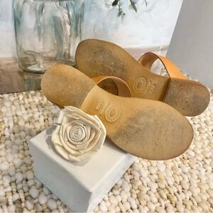 These are beautiful shoes! The Aria Cocobelle slide features an asymmetrical and minimal design, handcrafted in beautiful Italian leather. With a comfy asymmetrical top strap and toe ring, your foot will be comfortably held with each step. These slides have been kept in the box and have just minimal wear on the bottoms (see pics), and come from a smoke-free home.