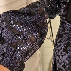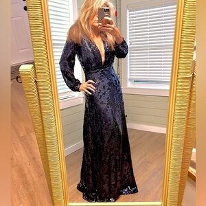 Rubber Ducky Productions, Small,Heavily Sequined,gorgeous navy blue with black, semi-sheer sleeves formal dress with an incredibly sexy elongated v-neck, open back and is lined. #instafashion · #instatravel · #instalifestyle · #instalove · #fashion · #lifestyle · #luxury