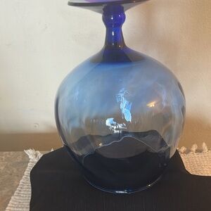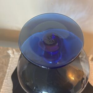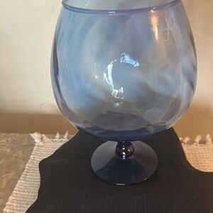 Blue mid century style Empoli Italian Hand Blown glass decorative snifter bowl. This glass piece is a translucent light cobalt blue . Beautiful unique swirled optic design as well as a foot pedestal base. There is one small air bubble, see pic 6.