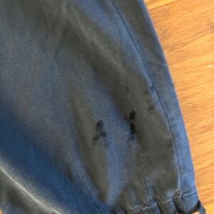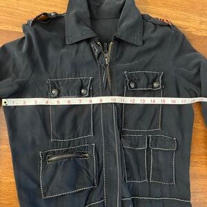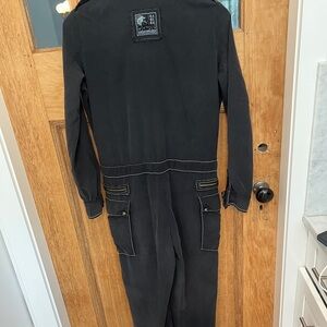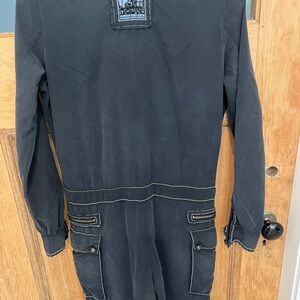 All silk bomber style jumpsuit. Plenty of pockets. Detailed stitching on shoulders. Zippered front and ties at waist and leg bottoms. Has a couple marks/stains at ankle, see pics. Hardly noticeable. Gorgeous soft silky flight suit!