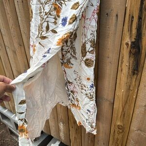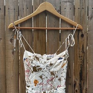 Chic Reformation dress with delicate floral design. Features blue and brown accents on a white base. Perfect for any occasion.