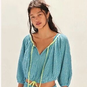 Rust floral top with gathered bust and puff sleeves.