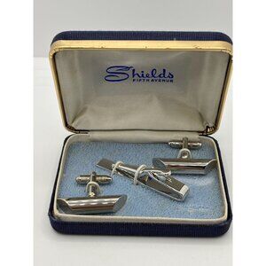 Mens Silver Polished Cuff Links and Tie Clip Vintage Classic