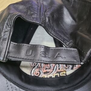 Vintage Sturgis North Dakota 2005 65th annual motorcycle bike rally leather strapback hat. Features Black leather cap with Orange, White and Yellow embroidered logo on the front and sides. Adjustable fit in excellent used condition.