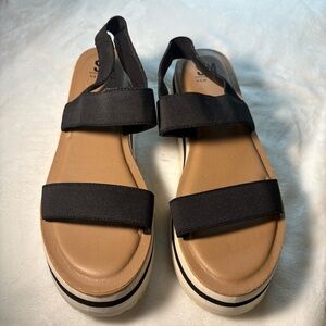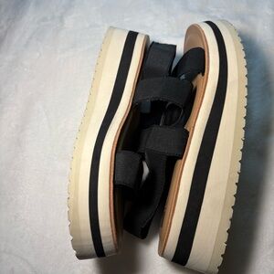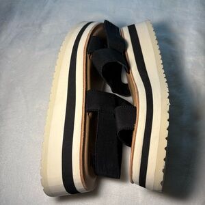 Like new. Platform is 1 1/2 inches at the toe and just under 2 inches at the heel. The back strap is stretchy/elastic material for additional comfort.