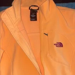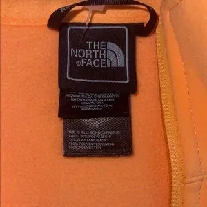 Vibrant orange fleece jacket with zip pocket. Features The North Face logo.