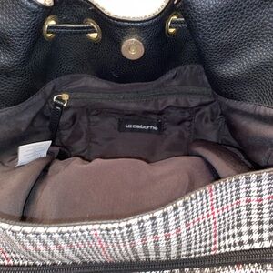 Large Liz Claiborne classic black and white plaid with red accent purse in excellent condition. The bag combines elements of a shoulder bag and a hobo bag with a spacious interior. It features a black tassel and gold-tone hardware, pleated sides and black lining. It has 3 compartments. The center compartment closes with a zipper, side compartments close with a magnetic snap. Interior zippered pocket and a divided pouch for cell phone/sunglasses. Approximately 15β at widest point and 19β from top of handle to bottom of bag. Wear with a beautiful red dress, blouse, or sweater for a traditional preppy look!