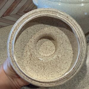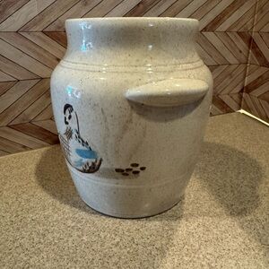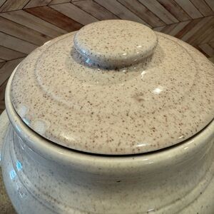 Vintage red wing Bob White cookie jar with a mismatched lid. The lid has chips. Please see all pictures. About 9 1/2 inches tall with the lid. There is no red wing stamp on the bottom. Top opening is about 5 inches diameter. No chips or brakes on the jar portion of the cookie jar. The lid has a similar speckled pattern, but I do not believe it is an original match