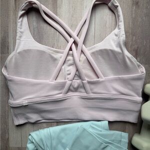 Stylish sports bra set for active comfort. Light pink bra with mint leggings. Perfect for workouts.
