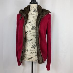 Orvis Faux Fur Lined Wool Blend Zip Up Red Pink Women's Small Knit Sweater A016