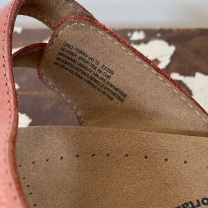 Taos means quality! “Stand up & get comfortable” beautiful salmon leather Double U sandals with suede footbed, Velcro closure, metal stud accent, excellent used condition, non smoking, pet free home.