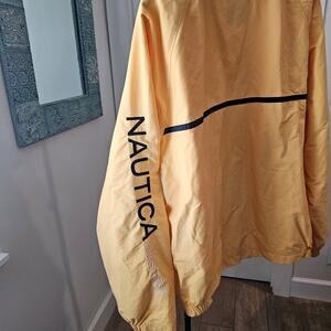 Vintage Nautica gold & blue zip-up wind breaker with hidden hood in men's size XL. One sleeve features "Nautica NS-83" and the other sleeve features a Sailing patch. Zipper closure front pockets and zipper and snap front closure. Hidden rolled hood in collar. Interior has multiple pockets for necessities. No staining or fading. Truley in amazing condition.