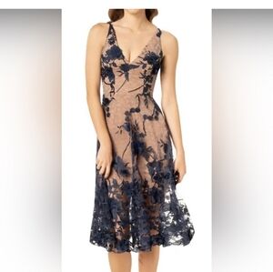 Elegant midi dress with navy floral lace overlay. Nude underlay enhances the design. Perfect for special occasions.