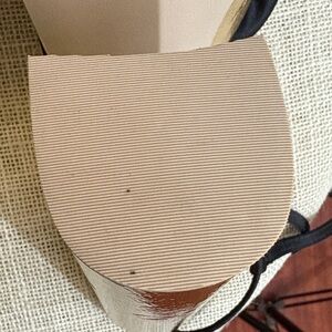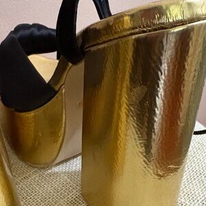 Elegant platform heels with a gold base. Features black straps and bow detail.