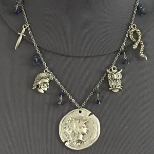 In Greek and Roman mythology, Athena (or Minerva) was the goddess of wisdom, war, heroism, and crafts. Often the patron goddess of heroic quests, Athena aided heroes such as Perseus, Hercules, Bellerophon, and Jason. Celebrate Athena, with this handmade necklace that features symbols of the goddess.