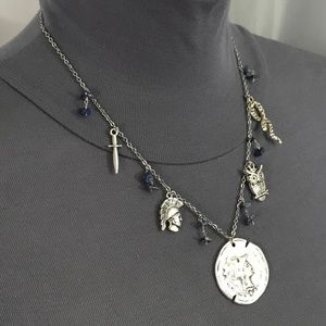 This necklace features at its center a silver coin pendant of the head of Goddess Athena. To its left is a charm of the helmet of a Greek or Roman soldier, and a snake charm, both symbols of Athena. To the right is an owl charm and a sword charm, also common symbols of Athena. Nugget chunks of real lapis lazuli (the stone of Athena) intersperse every charm and pendant and dangle from the center pendant as well. This necklace has been newly handmade just for you, is adjustable from 18.25 to 26.5 inches (can be made shorter or longer upon request), and is from a smoke and pet free home.